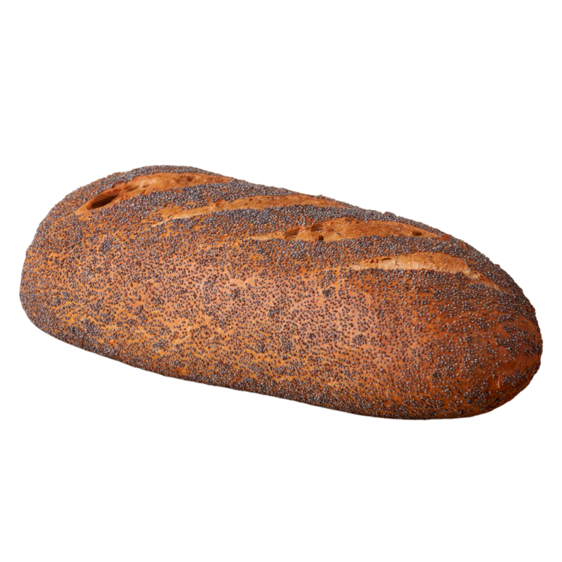 traditionelt bagt brød med surdej. med ristede sesam, solsikkekerne og hvedeflager. Blåbirkes på toppen.