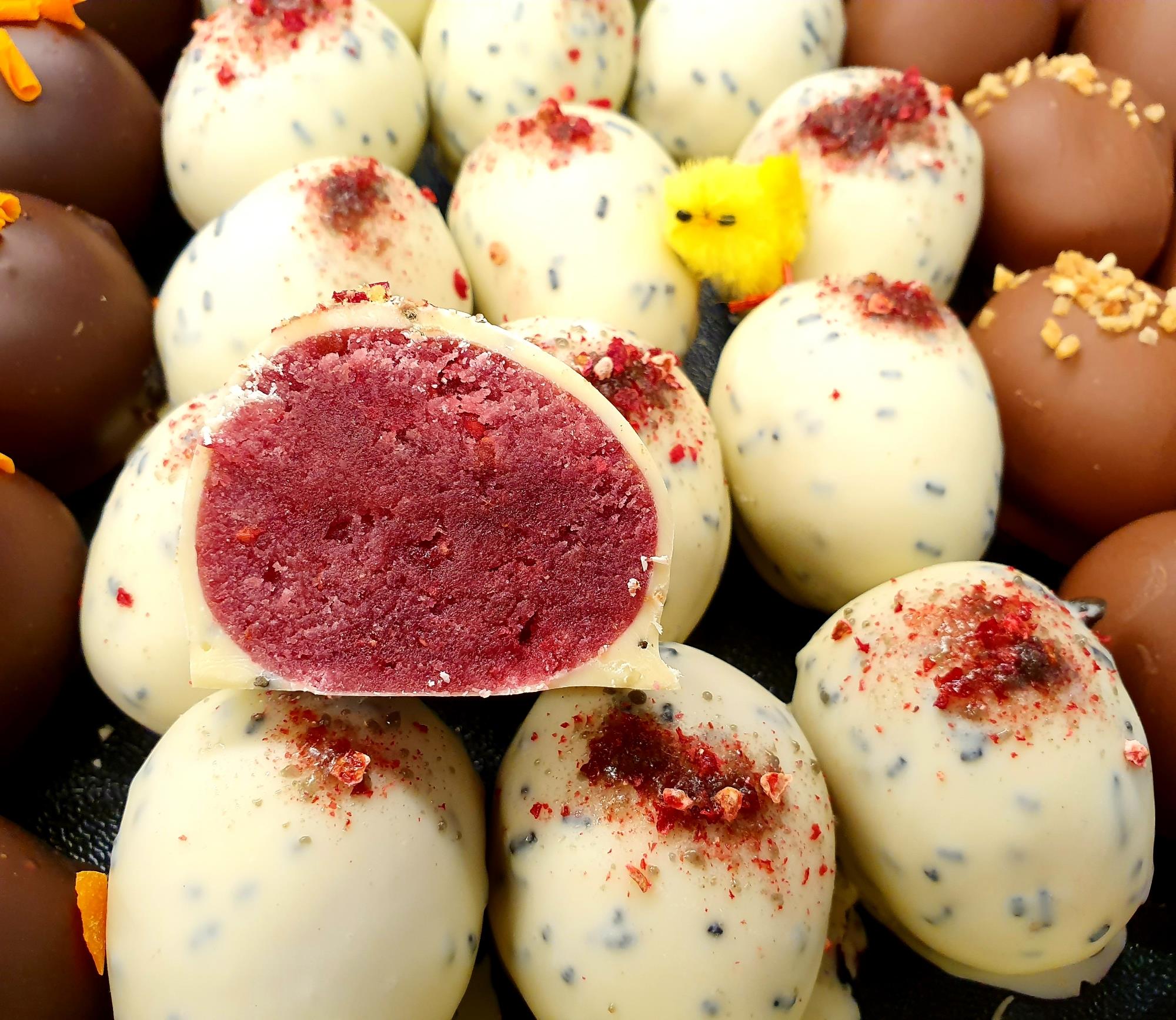 Råmarcipan med hindbær, overtrukket med hvid chokolade med lakrids.