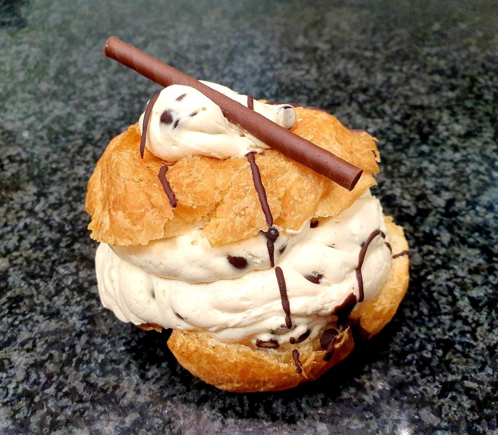 Wienerbrødsbolle med karamel-og-rom-flødecreme me chokoladestykker.