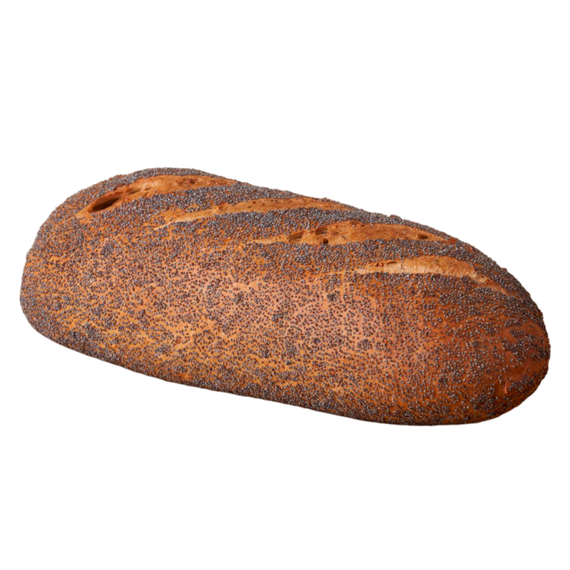traditionelt bagt brød med surdej. med ristede sesam, solsikkekerne og hvedeflager. Blåbirkes på toppen.
