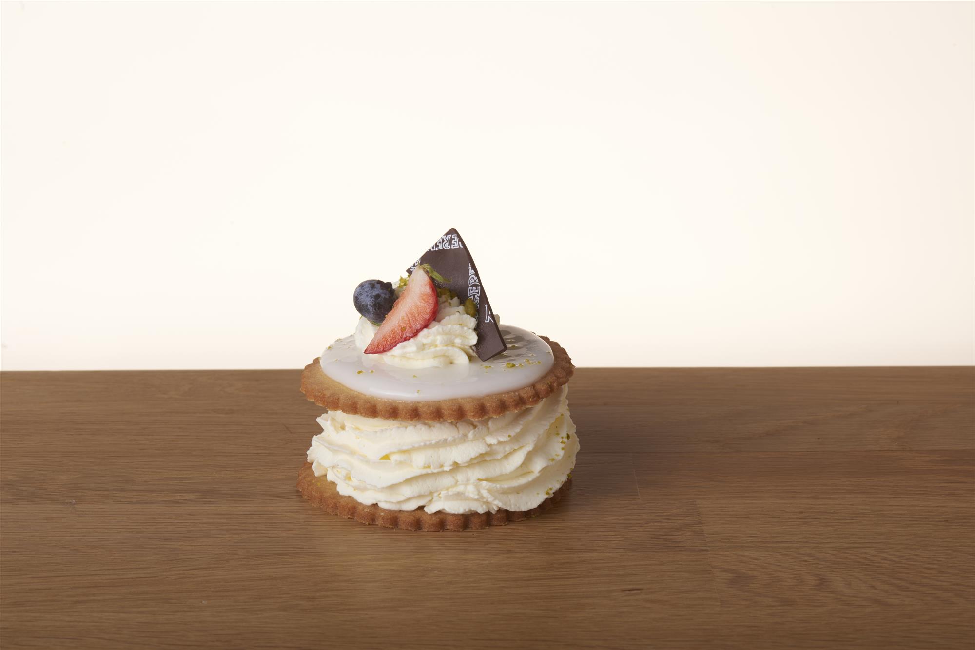 Lille flødekage lavet på linsedejsbunde, med flødeskum, vaniliecreme og hjemmekogt hindbærmarmelade. med glasur på toppen.