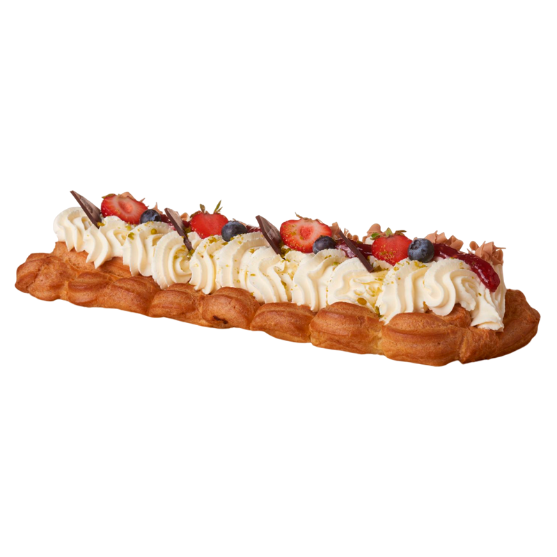 Vandbakkelse med chokolade, hindbærmarmelade, flødeskum og vaniliecreme. pyntet med frugt. 4-6 personer.